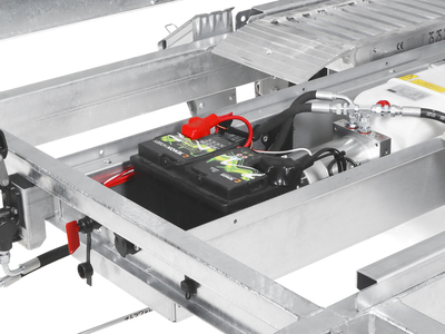 Il ribaltamento elettro idraulico è in 3 direzioni ed è comandato da un cilindro idraulico a 4 vie con pompa manual di emergenza.