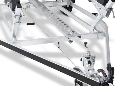 Questo modello è idoneo al trasporto di 1 o 2 moto d’acqua. I LED fanali posteriori sono separati ,con sistema di protezione a tenuta stagna ed entrambi vincolati al longherone del rimorchio che ruotando verso l’esterno consegntono di effettuare in maniera semplice e veloce le operazioni di varo ed alaggio. Le moto d’acqua vengono facilmente alloggiate su coppie di selle ricoperte di materiale plastico grazie alla presenza di rulli centrali regolarbili in altezza. Il telaio zincato a caldo garantisce una lunga durata alla corrosione. I cavi elettrici sono completamente nascosti e protetti all’interno del telaio. I cuscinetti delle ruote sono a tenuta stagna e per il lavaggio dei freni è presente di serie un kit apposito.