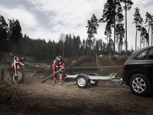 Il nostro trasporto MC è adatto per trasportare fino a due moto il rimorchio è dotato di anelli di fissaggio.. La rampa singola viene alloggiata in modo sicuro durante il trasporto. La capacità di carico del rimorchio lo rende adatto sia alle moto più moderne che a quelle classiche. Le immagini sono solo a scopo illustrativo e potrebbero mostrare accessori opzionali.